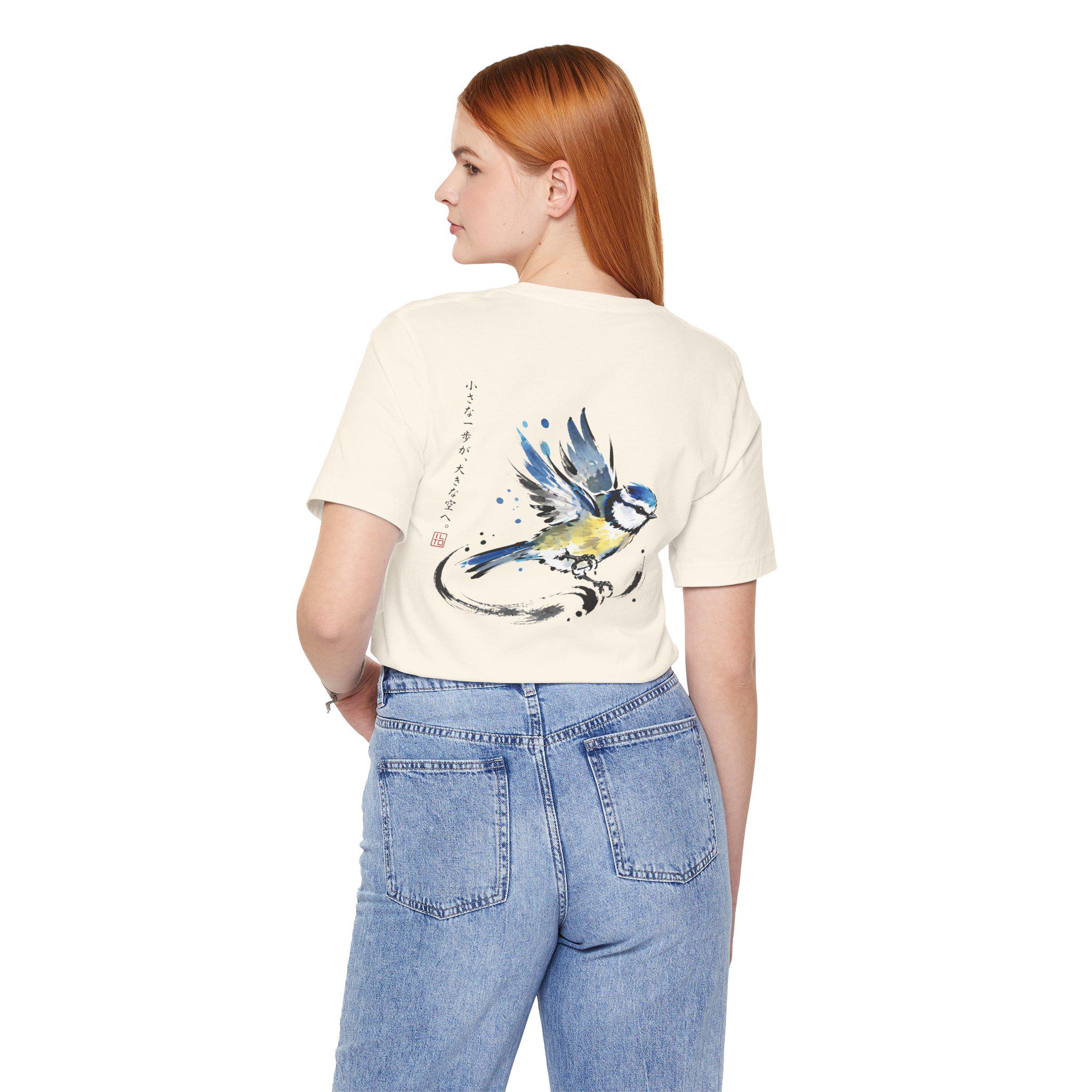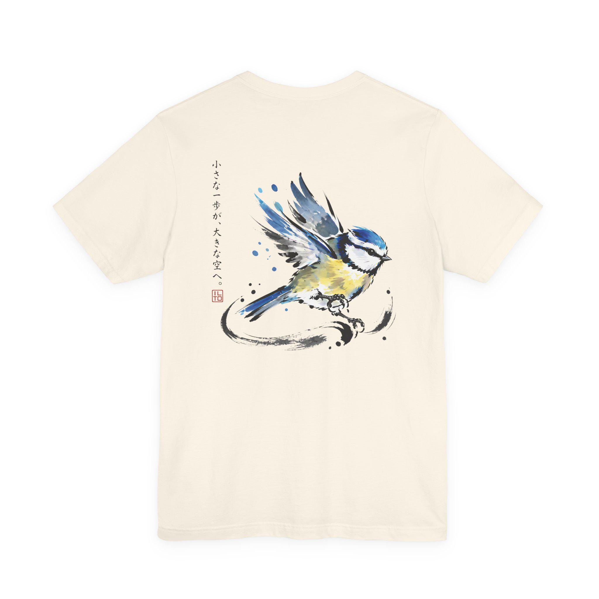 Lightweight, breathable, and gently tailored — this cotton tee carries a calm, artful energy. A small, neat emblem rests on the chest while the back shows a lively watercolor blue tit in mid-flight, brushstrokes and ink washes suggesting motion and quiet joy. The soft natural fabric drapes easily for everyday wear, layering under jackets or standing on its own during milder days. It feels like a familiar walk through a garden at dawn: attentive, slightly nostalgic, and quietly spirited. Wear it when you want a subtle statement that reads as thoughtful rather than loud — for slow mornings, city strolls, or simple meetups with friends.