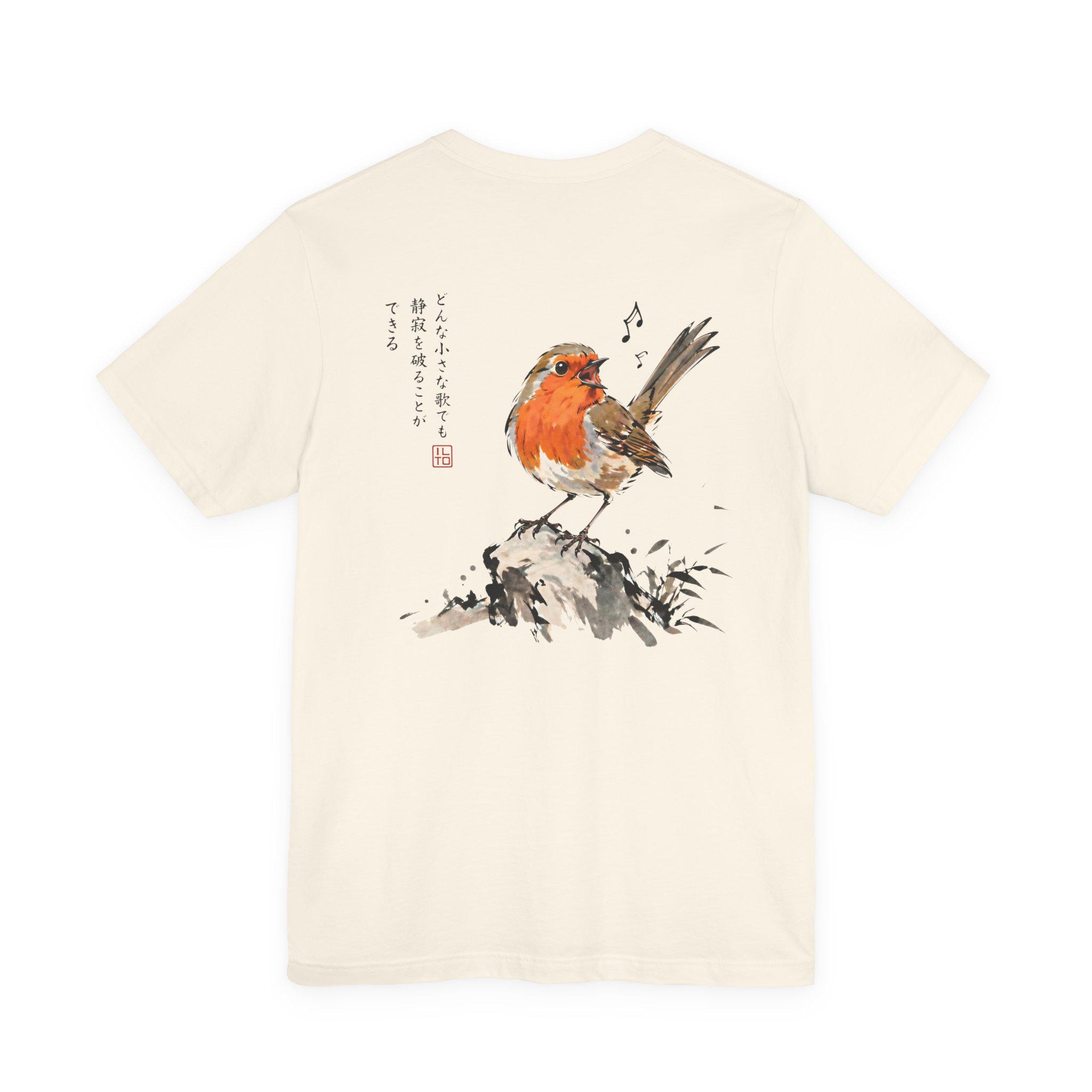 Light, quiet, and artful — this tee carries a little moment of the outdoors with you. A softly washed canvas of premium Airlume cotton holds a delicate watercolor-style robin perched on a brush-stroked rock, with a vertical column of subtle Japanese characters beside it. The design feels like a shared secret between a morning walk and a sketchbook page: gentle, attentive, and calm. Wear it on slow coffee mornings, neighborhood birdwalks, or layered under a jacket for museum afternoons. It’s for people who notice small things — the way a song hangs in the air, the warmth of a sun patch, the comfort of thoughtful, pared-back design.